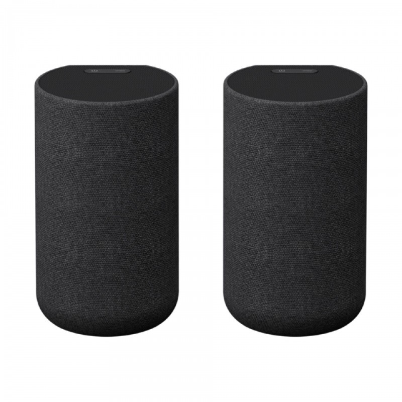 Colunas traseiras sem fios montáveis na parede para a sua barra de som, com coluna direcionada para cima, tweeter, woofer, radiadores passivos duplos e uma bateria integrada.